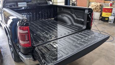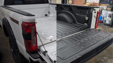 In order to apply this product we carefully cover the whole vehicle with plastic sheeting to avoid any overspray. Then, we thoroughly scuff the bed surface to ensure proper adhesion. We then degrease the whole bed and then the RaptorLiner® is sprayed.